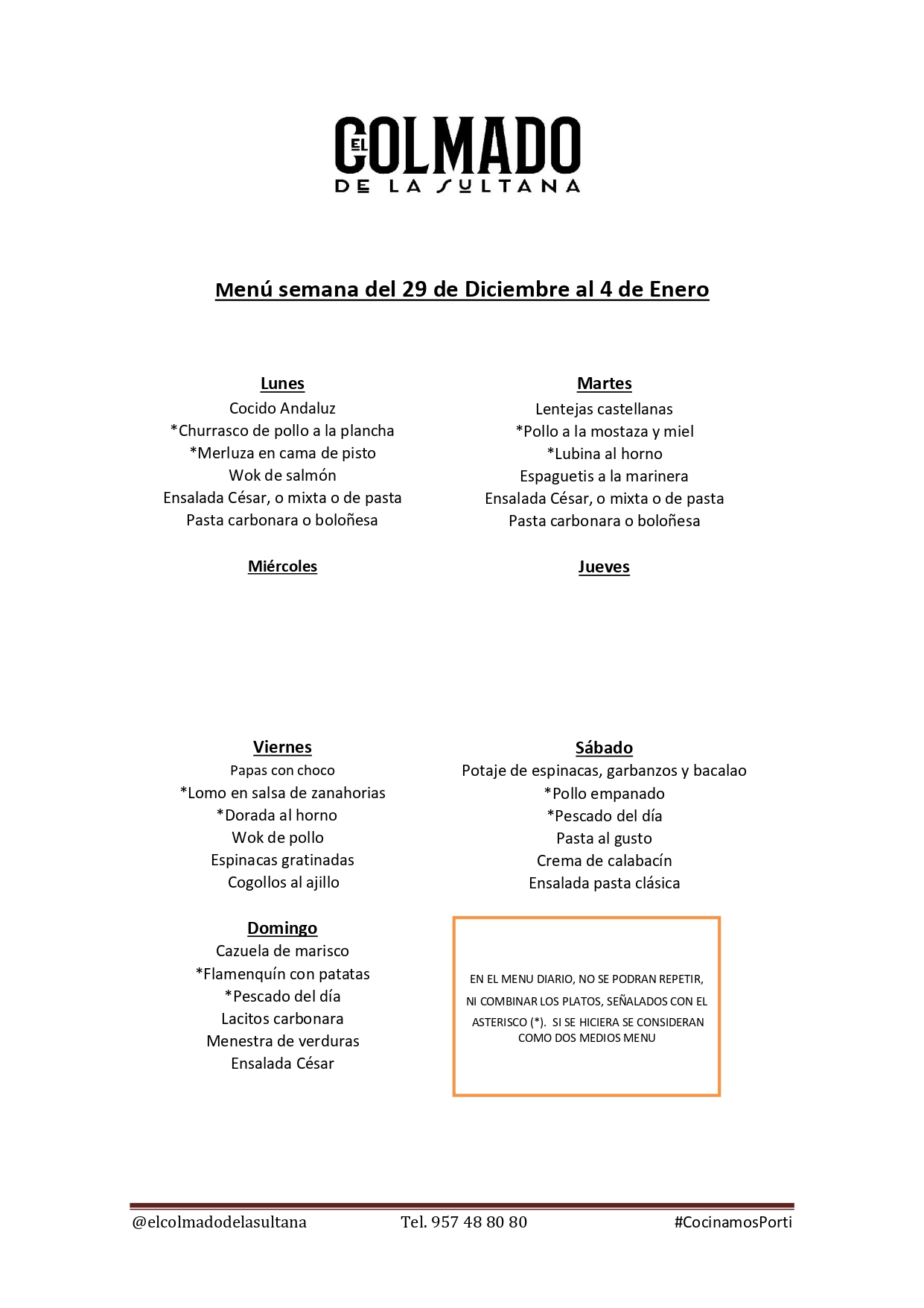 El menú del día puede pedirse hasta las 22:00h del día anterior. (Para pedidos en el mismo día consultar por teléfono: 957 48 80 80)