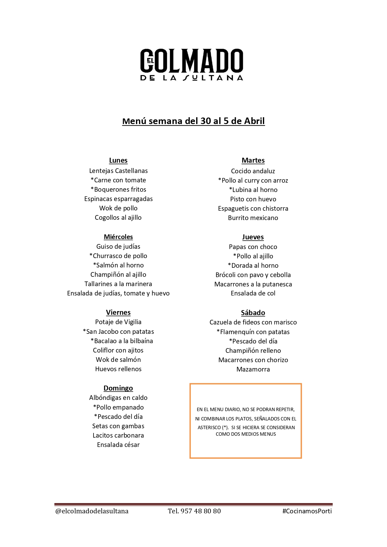 El menú del día puede pedirse hasta las 22:00h del día anterior. (Para pedidos en el mismo día consultar por teléfono: 957 48 80 80)